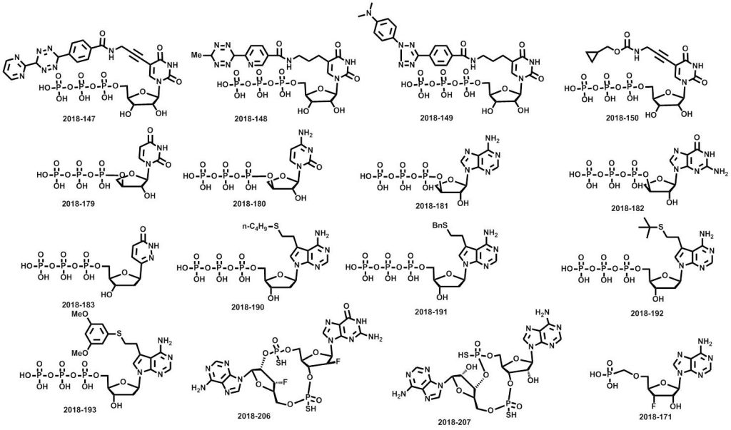 Nucleoside 5′-O-Triphosphates are usually substates or inhibitors of polymerases. They are widely used in drug Discovery for a varies of viruses like HCV, HBV, HIV, and Coronavirus to target either RNA dependent RNA polymerases, DNA dependent DNA polymerases, reverse transcribe DNA polymerases. We are also able to synthesize 5′-O-tetraphosphate, 5′-O-pentaphosphate, 5′-O-hexaphosphate, 5′-O-nonaphosphate, and 5′-O-polyphosphate nucleotide analogues. We are also working on oligonucleotides, and conjugation of oligonucleotides with lipid and fluorescence dye.